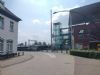 Moderne rechthoekig bouwsel op voorplein, met glazen luchtbrug.