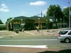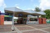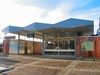 doorgangsgebouw op voorplein. Overkapt door een gegolfd dak met aan twee kanten dienstruimten