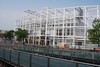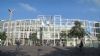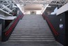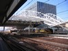 witte ruimtevakwerkconstructies. Gebogen witte schelp van centrale perronkap. Grote vides in de perrons. Glazen bouwstenen, transparante gevels.