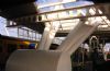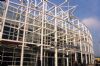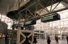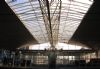 witte ruimtevakwerkconstructies. Gebogen witte schelp van centrale perronkap. Grote vides in de perrons. Glazen bouwstenen, transparante gevels.