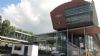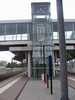 Een groot kantoorpand met een ingebouwde passerelle over de sporen.