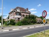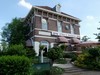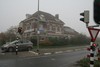 asymmetrisch. Links een lage vleugel. In het linkerdeel van het hoge deel de toegang tot de woning. De ingang tot het station in de rechterzijgevl.