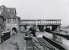 royaal station. Hoog linkerdeel met aangebouwd torentjeen een iets lager rechterdeel. Eilandperron met trappen en luchtbrug bereikbaar. Wachtkamers daarom op verdieping aangebracht