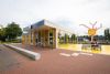 Het gebouw is gehalveerd om plaats te maken voor een nieuw plein. Achter een glazen pui wordt een stations huiskamer aangelegd. De ingang komt in de glazen zijgevel.