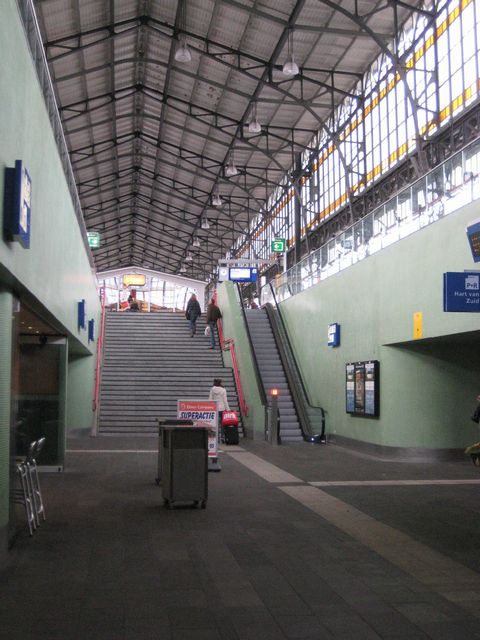 verwant aan Leiden. Tunnel mondt via trap uit op eilandperron met oude perronoverkapping