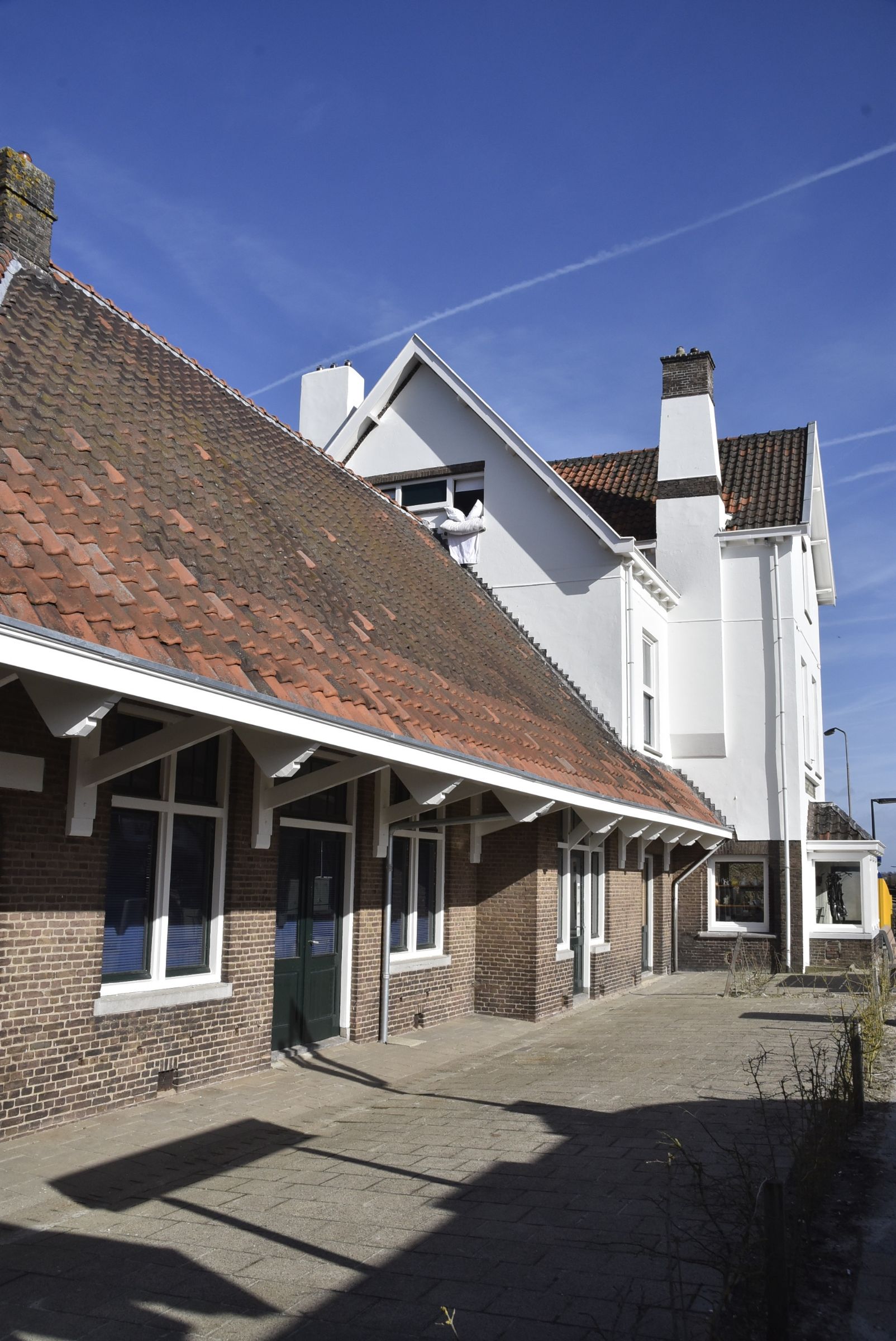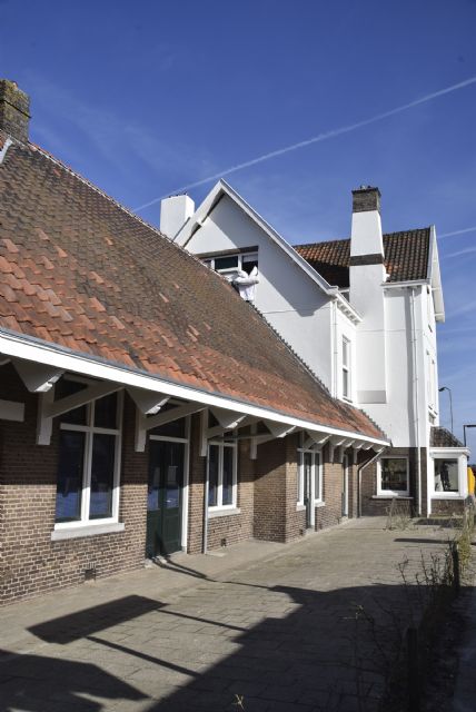 hoog gedeelte en laag deel met opvallend hoog dak. Ingang in de zijgevel