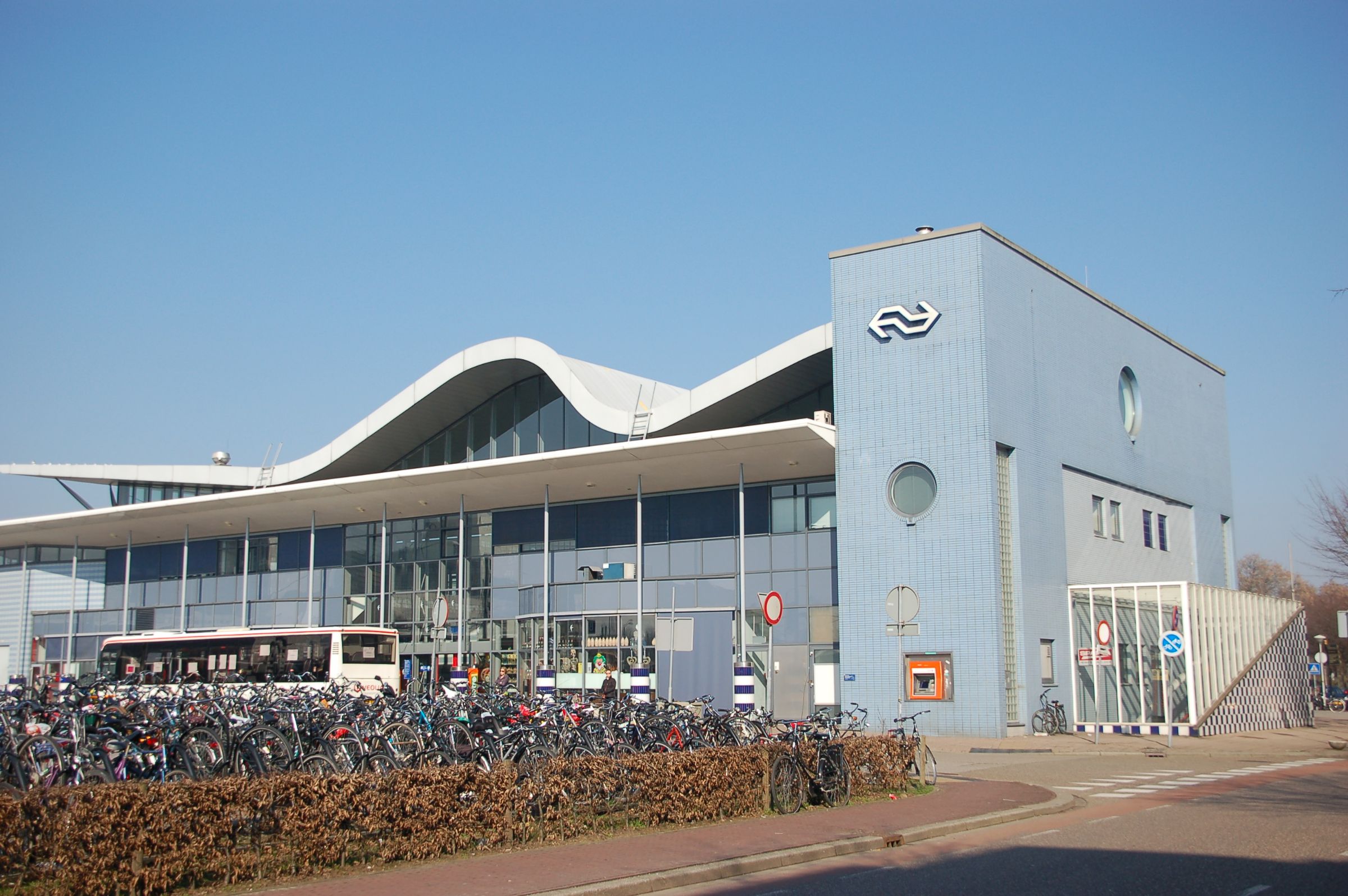 net als bij amstelstation de stationshal haaks op de sporen geplaatst. Gegolfd dak met glazen puien.