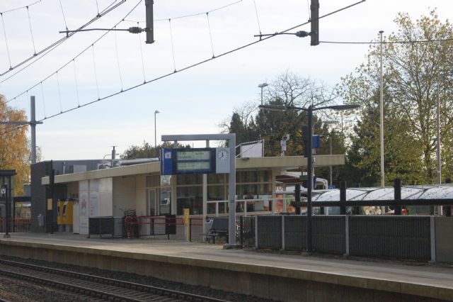 standaardstationsgebouw. Baksteenschijf aan straatzijde door lokale kunstenaar.